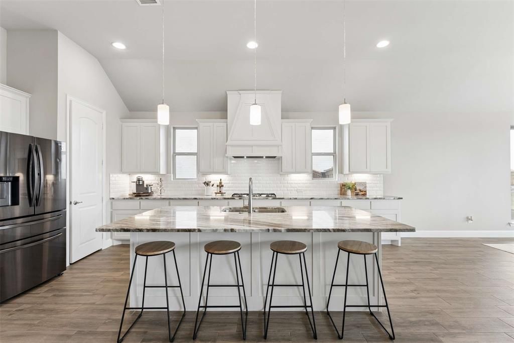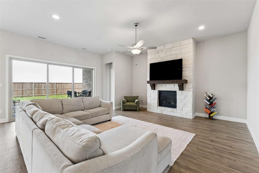 Located on a quiet cul-de-sac in the highly sought after Cambridge Crossing community in Celina, this beautifully designed one-story UnionMain home offers a functional layout ideal for everyday living and entertaining. Zoned to highly sought after Celina ISD, with an on-site elementary school just a few blocks away, this location is an exceptional opportunity to be part of one of the area’s most desirable neighborhoods. A wide entry with tray ceilings welcomes you inside, where wood-look tile floors run throughout the home for a cohesive, low maintenance finish. The open-concept floor plan is filled with natural light and anchored by a stunning living room featuring a floor to ceiling stone fireplace with gas logs, a cedar mantle, and sliding doors that open to the covered patio for seamless indoor-outdoor living. The kitchen features stainless steel appliances, including a 5-burner gas cooktop, shaker style white cabinetry, leathered granite countertops, an oversized island with pendant lighting, and beveled subway tile backsplash. The dining area overlooks the backyard and is generously sized for daily living and entertaining. The private primary suite offers a spa inspired bath with quartz countertops, dual sinks, oversized mirrors, shaker cabinetry, a freestanding tub, separate shower with bench, linen storage, and a large walk-in closet that connects to the oversized utility room. Three secondary bedrooms include walk-in closets. Two share a Jack and Jill bath, while the third is near a full hall bath. A mud bench with board and batten accent wall adds functionality off the three-car garage that also has a sink. Includes whole home water filtration and softening system. Enjoy the covered patio with gas stub for grilling. Cambridge Crossing amenities include 7 Lakes, amenity center, fitness center, pickleball courts, half-court basketball, scenic trails, fishing pond, playground, lap pool, resort pool with cabanas, event lawn, and a future second amenity center.