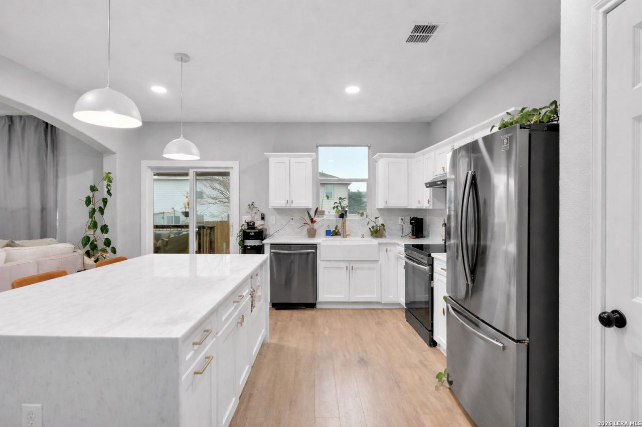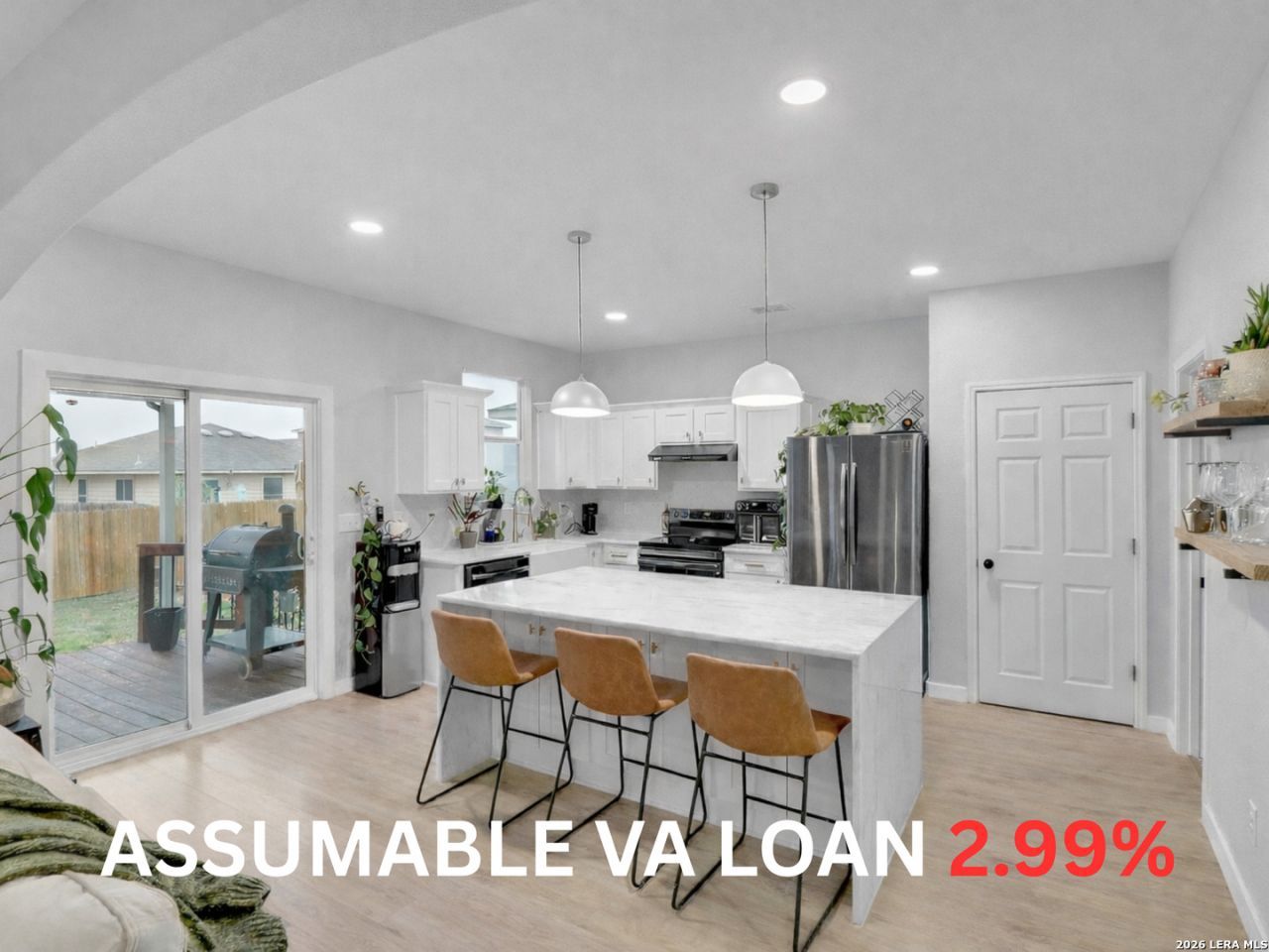 Take advantage of an assumable VA loan at an incredible 2.99% interest rate. This beautifully upgraded two-story home is located in the well-established Miller Ranch community and offers 3 bedrooms, 2.5 bathrooms, and 1,948 square feet of thoughtfully designed living space. One of the standout features of this property is the solar panel system, delivering outstanding energy efficiency with average annual electric bills under $80 per month, providing substantial long-term savings for the homeowner. Updated enhancements include luxury vinyl plank flooring, and updated lighting and fixtures throughout. The modern kitchen is designed to impress, featuring a sleek island with a built-in microwave, waterfall-edge marble countertops, and upgraded appliances, perfect for both daily living and entertaining guests. Additional improvements include renovated bathrooms and radiant barrier insulation in the attic for added energy efficiency. The outdoor space offers a private backyard retreat complete with a covered patio, newly stained deck, ideal for relaxing evenings or hosting gatherings. Conveniently situated near Randolph AFB, Fort Sam Houston , San Antonio Military Medical Center, I-10, Loop 410, shopping, dining, and within Judson ISD, this home combines style, efficiency, and an exceptional location.